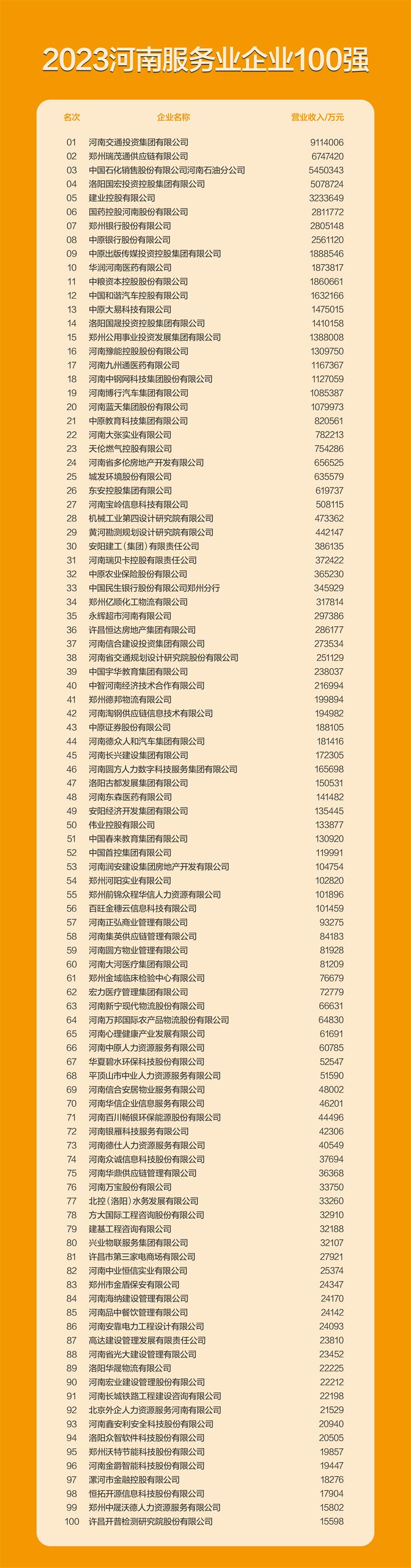 許繼集團有限公司、河南黃河實業(yè)集團股份有限公司、西繼迅達電梯有限公司;許昌市榮獲“2023河南服務業(yè)企業(yè)100強”的企業(yè)有